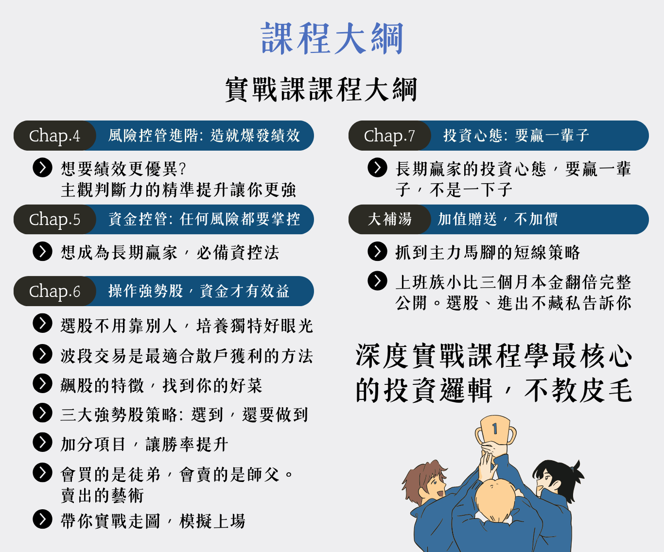 課程還提醒我穩定心態和風險管理的重要性,這對我的交易信心幫助很大。我期待在未來的五年裡,透過持續的學習和調整,在投資之路上穩步成長。這次學習經驗真的讓我收穫滿滿! - 退伍軍人