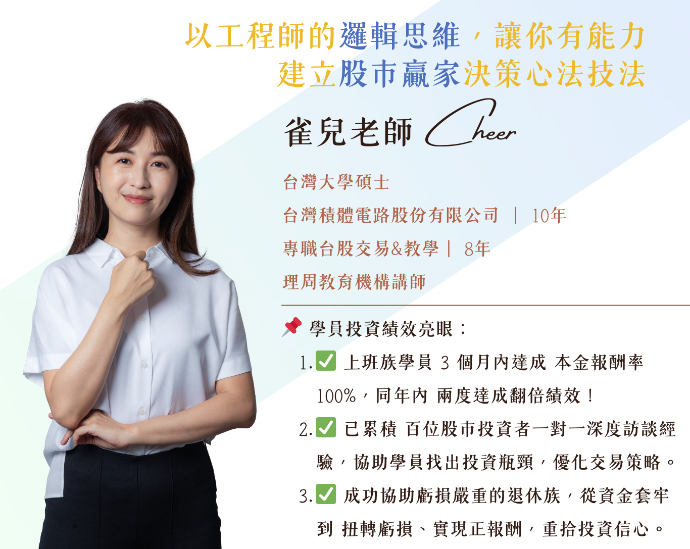 最初,我希望找到一門專業課程,學習如何正確判斷買賣股票的時機。經過 CHEER 教練的建議上完課後,我有種被開啟智慧的感覺,逐漸理解波段交易,並發現自己過去買賣股票常受情緒影響,現在能更穩定面對市場變化。